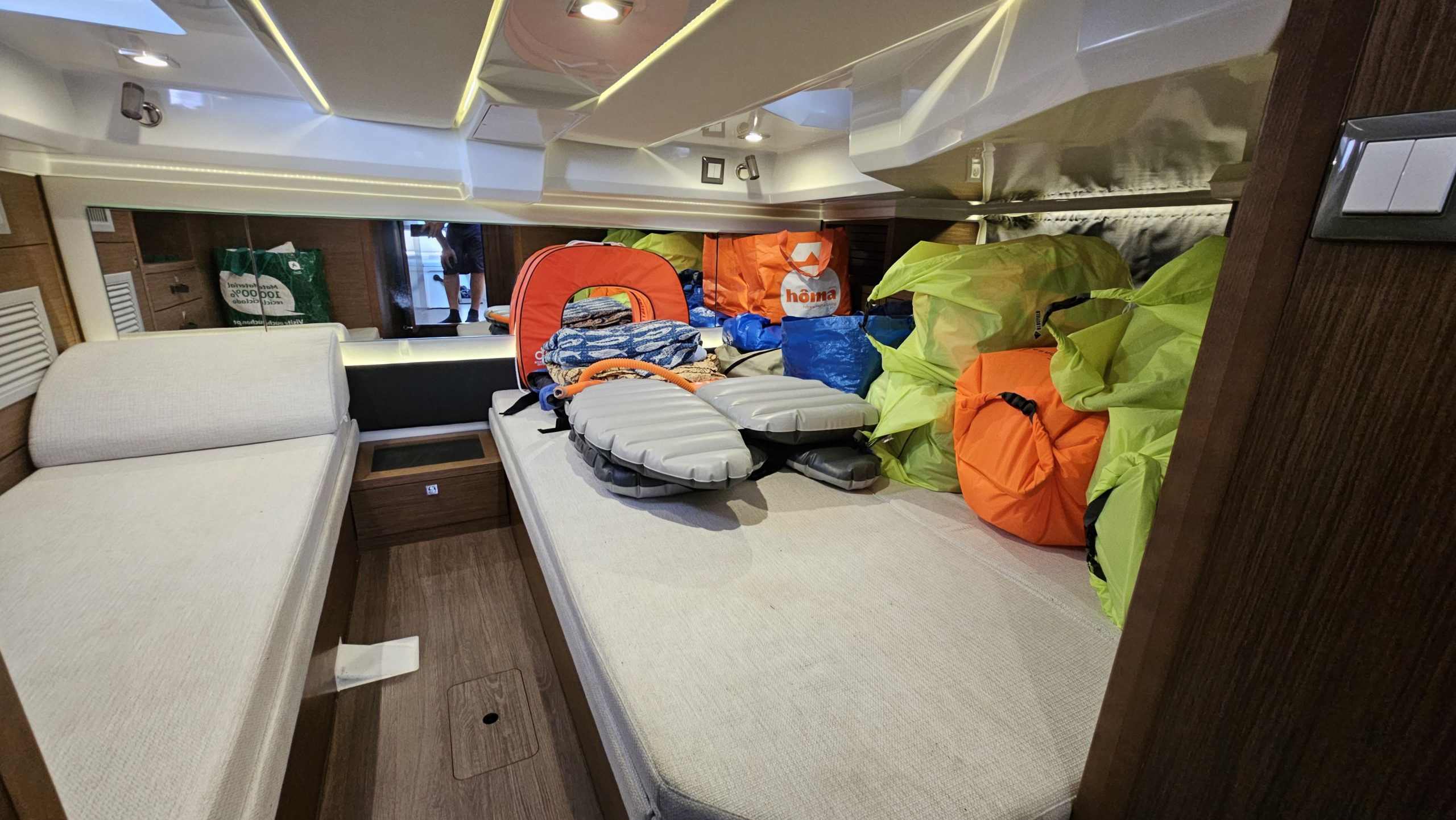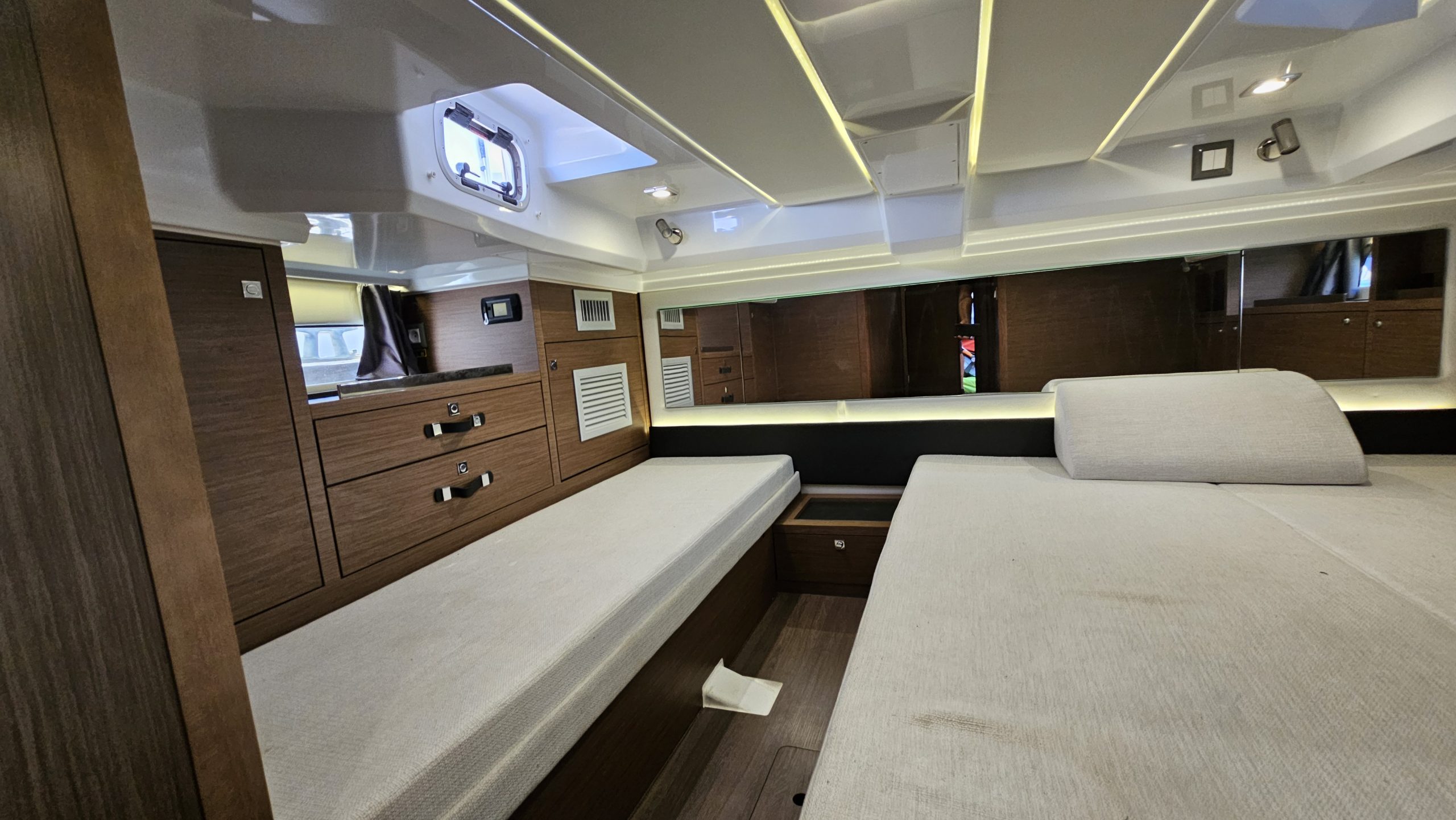 Accommodations: Accommodations for up to 5 people in one aft cabin plus convertible seating in front, Front V-shaped seating with table (converts into a berth), Aft cabin with a double berth and sofa, Starboard bathroom includes electric WC, hand basin, and separate shower Galley includes electric stove, fridge, and a sink